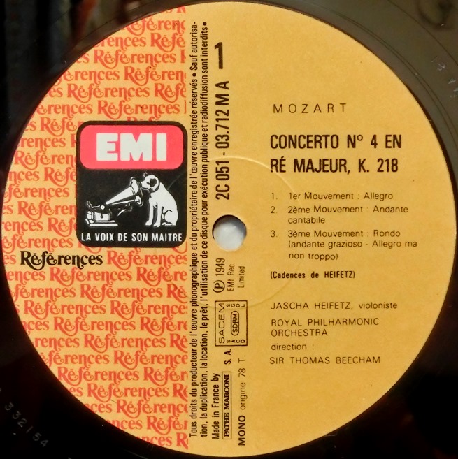 仏EMI ビーチャム&ハイフェッツ/モーツァルト Vn協奏曲第4番, フルートとハープのための協奏曲