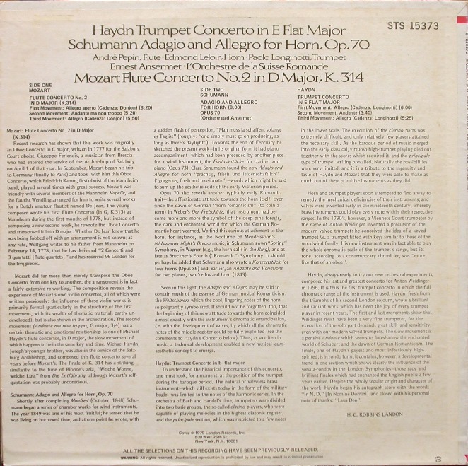 アンセルメ/モーツァルト フルート協奏曲第2番、シューマン アダージョとアレグロ、ハイドン トランペット協奏曲