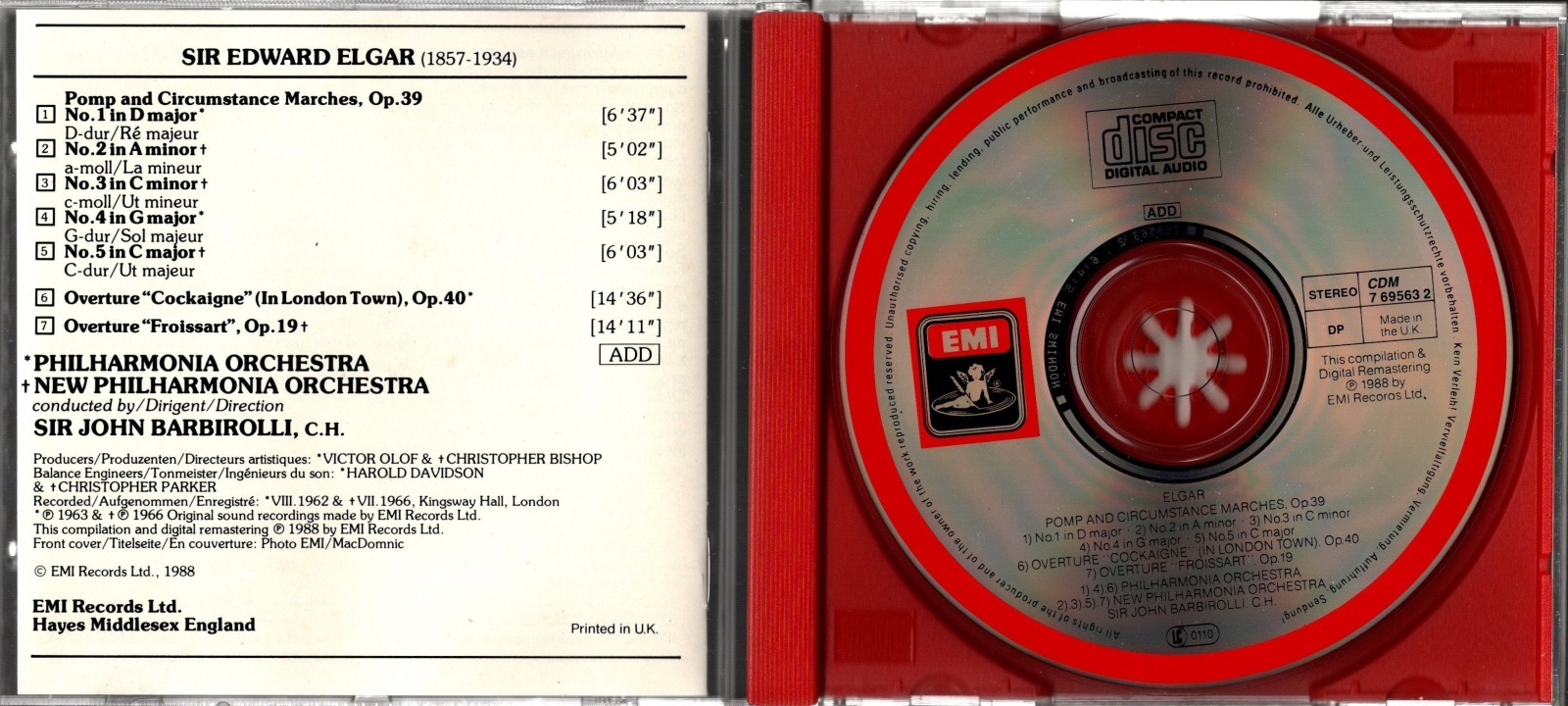[中古CD] 英EMI バルビローリ/エルガー 威風堂々第1〜5番, 序曲コケイン, フロワッサール