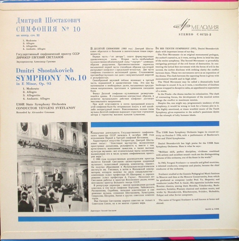 スヴェトラーノフはショスタコーヴィッチは5番,7番,9番とこの10番しか録音していません。この作曲家の交響曲には他にもいい演奏が十分あるから今さら、と考えたのかもしれません。