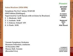 交響曲第2番はハース版が1938年に、より原典に忠実なノヴァーク版が当録音年の1965年に出版されていたが、トロント響では改訂版のパート譜しか用意出来なかったようだ。それでもブルックナーの初期作品に見られる荒削りな前衛性は、トロント響のメンバーや聴衆には刺激的だったろう。
