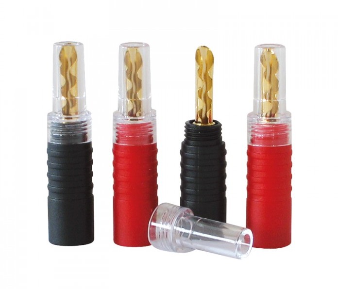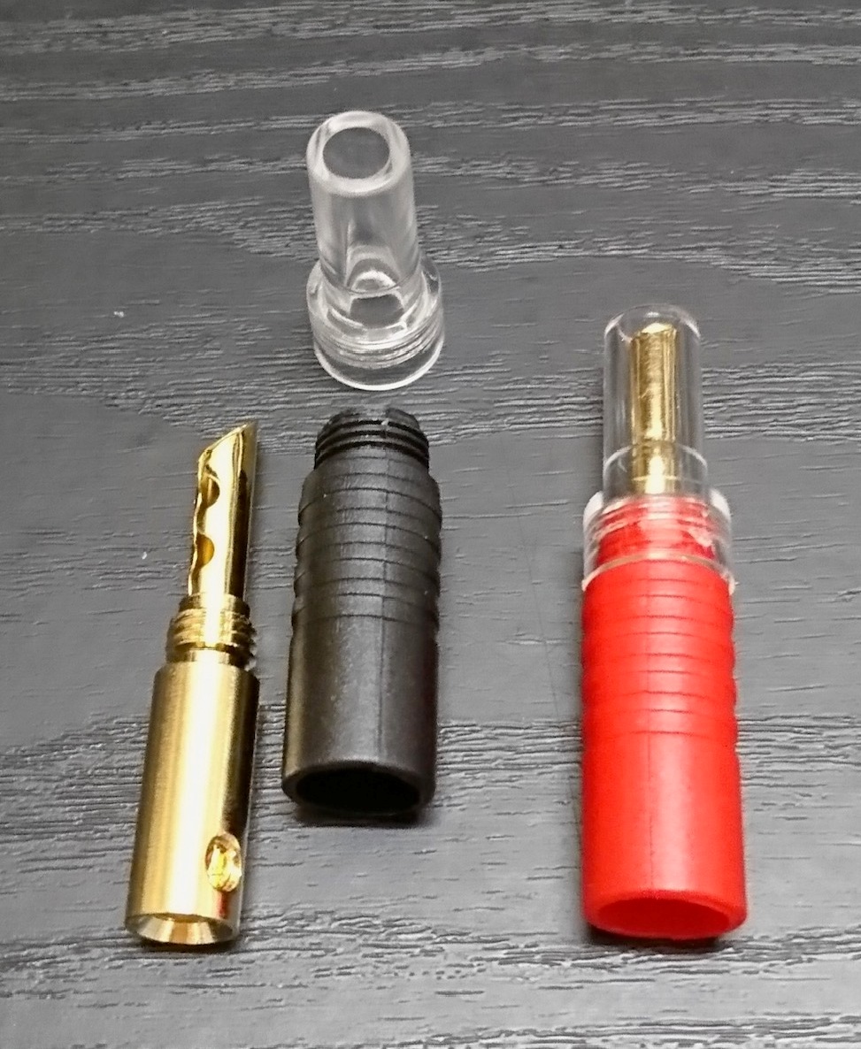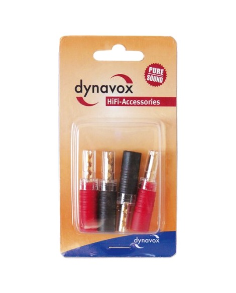 ダイナヴォックス社のバナナプラグ(4個セット、赤2個,黒2個)。スピーカーケーブルの接続に使います。