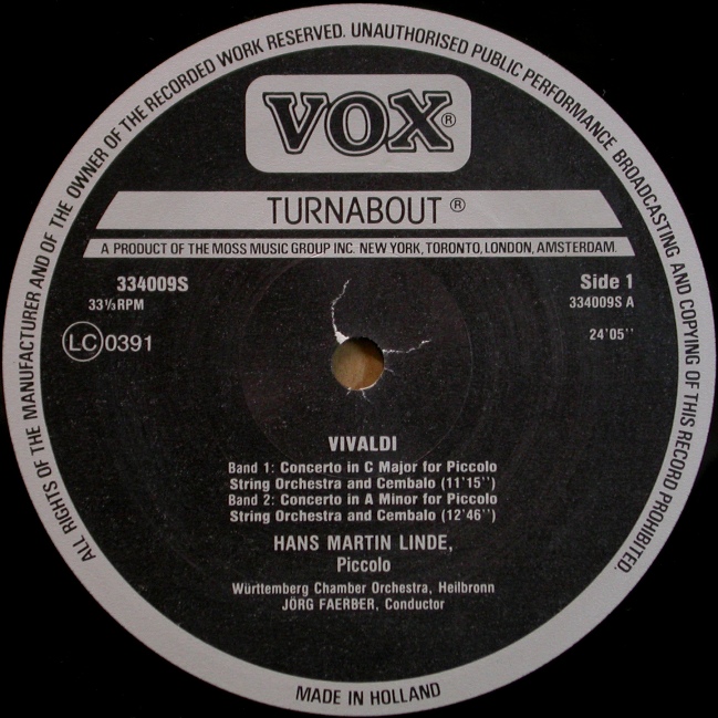 ギュンター・レメン(Va d'amore)、アントン・スティングル(Lute)、ハンス・マルティン・リンデ(Piccolo Bfl) イェルク・フェルバー指揮 ヴュルテンベルク室内管弦楽団